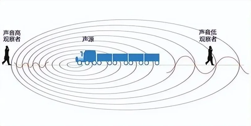 对于声波来说,当波源(火车)朝着观测者(站台等待的人)运动时,声波会被压缩,波长变短,频率变高,因此我们听到的声调就会变高;当波源远离观测者时,声波会被拉伸,波长变长,频率变低,因此声调就会变低。