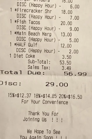 据该顾客分享的账单信息显示,餐厅菜单原价为56.99美元,但顾客实际在“欢乐时光”折扣后仅支付29美元。然而系统在计算20%建议小费时,仍以原价为基础,直接给出了16.50美元的小费选项,相当于超过实际账单金额的一半。这一设计让不少网友感到震惊并质疑其合理性。