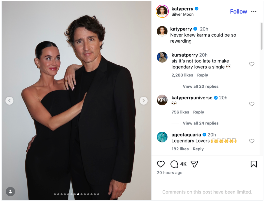 佩里发布这条动态之际,正值她和特鲁多这对情侣日益公开他们的恋情。他们于去年12月在社交媒体上正式公开了这段恋情。