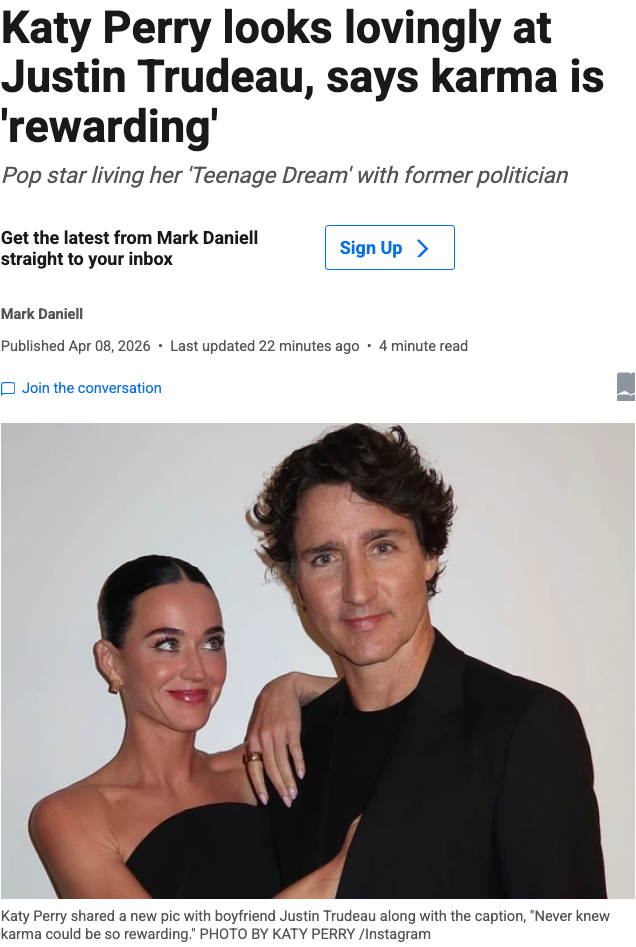 尽管两人都未公开评论过他们的关系,但自去年夏天在蒙特利尔被拍到共进晚餐以来,佩里和特鲁多就一直被传出绯闻。
