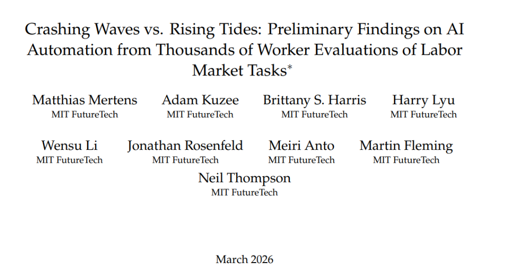 2026年3月,麻省理工学院FutureTech团队发布工作论文《巨浪还是潮汐:来自数千名工人对劳动力市场任务评估的AI自动化初步发现》(论文编号:arXiv:2604.01363v1),作者包括Matthias Mertens、Neil Thompson等人,研究资金来自Open Philanthropy及一家科技公司。