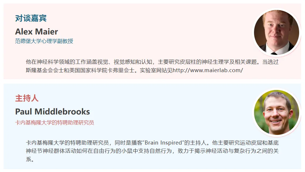 保罗:今天的嘉宾是亚历克斯(Alex Maier)。亚历克斯是范德堡大学的心理学副教授,并领导着迈尔实验室。他在神经科学领域的工作涵盖视觉、视觉感知和认知,主要研究皮层柱的神经生理学及相关课题。今天,他将与我们探讨近年来其研究焦点的转向——意识神经科学。他要和我们聊聊近年来研究焦点的一次大转弯——转向了意识神经科学。其实说回归更贴切,因为大家待会儿就会听到,这可是他最初的“白月光”领域。
