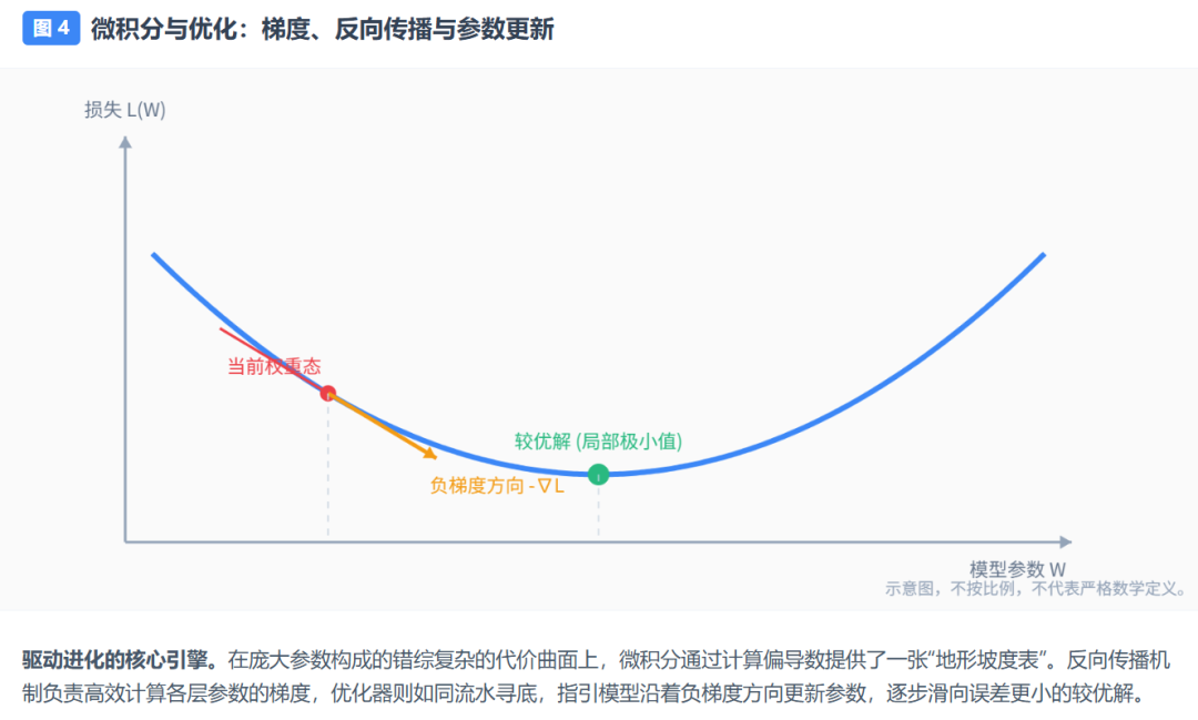 微积分是驱动参数优化的脉搏。模型在部署前(训练阶段)通过它在错误中学习;而在我们日常使用 ChatGPT 时(推理阶段),这一引擎已经熄火,模型参数被冻结,不再进行梯度更新。