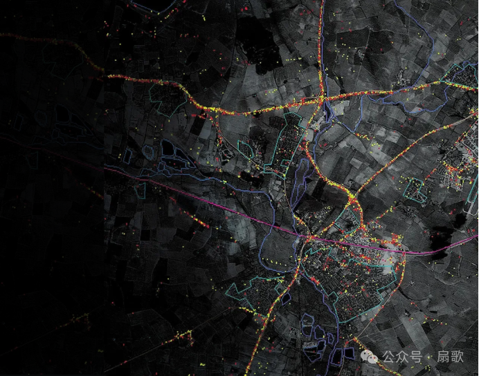 SAR 模式通俗理解,就是用雷达成像生成类似卫星照片的目标区域图像,可对固定区域或目标进行精细扫描与分类,捕捉光学系统难以发现的细节,且不受天气限制,例如地下导弹基地轮廓、加固军事设施等。与 GMTI 配合使用,可实现精准识别与态势追踪。大家可以看屏幕示例:GMTI 轨迹叠加在 SAR 图像上,目标移动轨迹与精确位置一目了然。