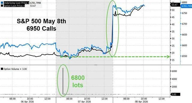 这位身份不明的交易者在北京时间周二晚间22:20左右,花费了约1200万美元的期权费,购买了6800手执行价为6950点、5月8日到期的标普500指数看涨期权,当时该指数交投于约6556.21点。