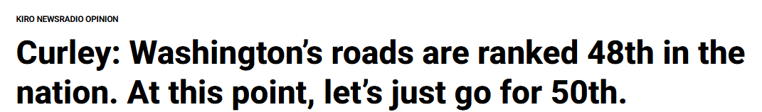 在最新的全美公路系统评比中,华盛顿州的表现再次刷新下限——去年排名第47位,今年直接跌到了第48位。目前全美仅剩阿拉斯加州(第50名)和加州(第49名)排在我们后面。