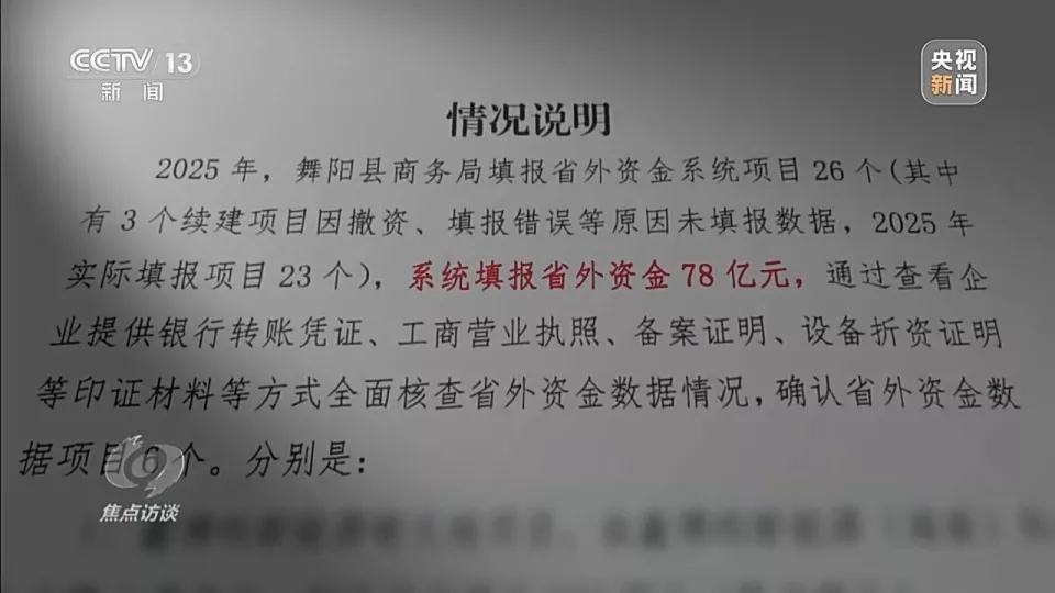 省外资金,简单来说就是从本省以外地区引进来的投资资金。2000年前后,我国多地开始将引进省外资金作为推动区域发展的重要抓手,一些省份将引进省外资金作为加快发展的关键举措,开始建立省外资金统计通报与排名机制,省际围绕项目、资源、政策展开激烈竞争。在这一过程中,部分地方出现了省外资金统计严重失真失实的情况。2025年1月到11月,河南省漯河市舞阳县上报省外到位资金78亿元,但当记者调查时,当地承认实际到位金额仅为1亿多元。