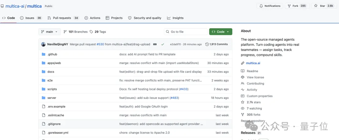 同款但开源项目Multica,目前在GitHub已迅速揽获2.6k Star: