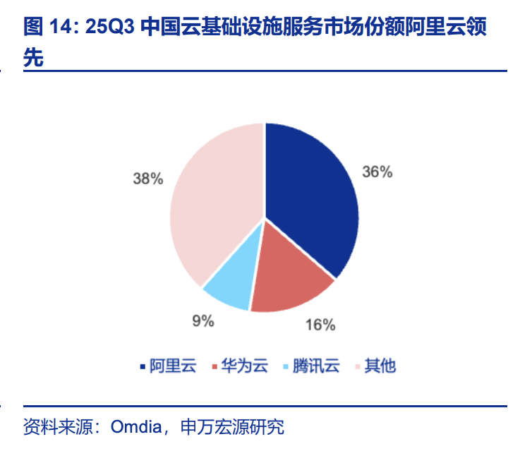 在市场份额方面,阿里云的领先地位相当稳固。据Omdia数据,2025年上半年中国AI云市场规模达223亿元,阿里云以35.8%的份额位居第一,超过第2至第4名总和。在公有云IaaS市场,其同样以21.31%的份额领跑。2025年第三季度,中国大陆云基础设施服务市场总规模为134亿美元,阿里云占据36%,华为云和腾讯云分别为16%和9%,头部集中效应显著。