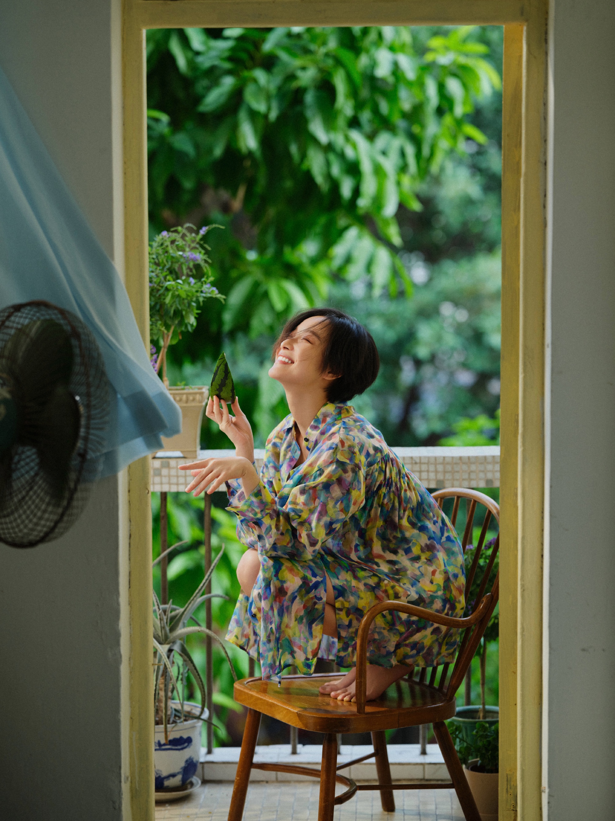 自在地蹲在椅子上吃着西瓜,清新的空气也扑面而来。