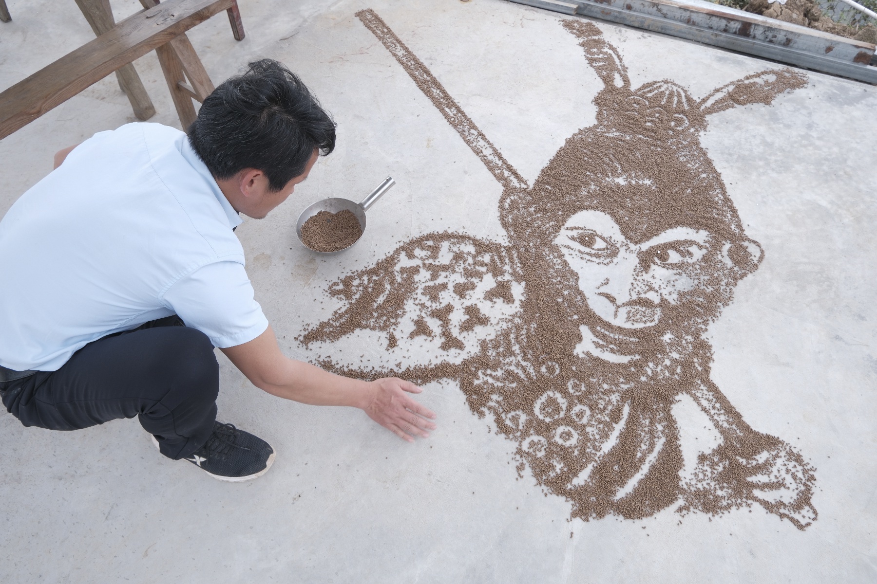 正是这个爱好,让他在平常的农活中发现了独特的创作方式。一次投喂小龙虾时,他无意间划破了小龙虾饲料袋。看着撒了一地的饲料,他想起自己此前曾用莲子摆出过中国地图。