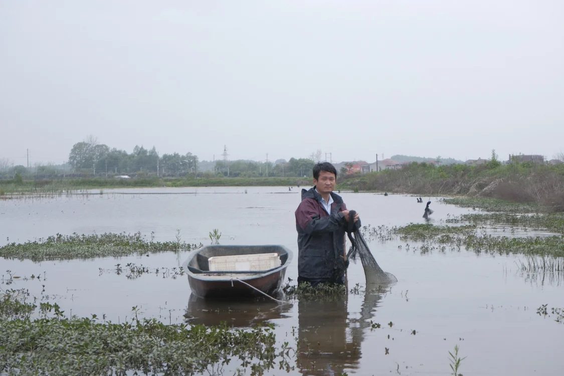 陈亮在小龙虾养殖池塘劳作。图/九派新闻 蔡晓萱