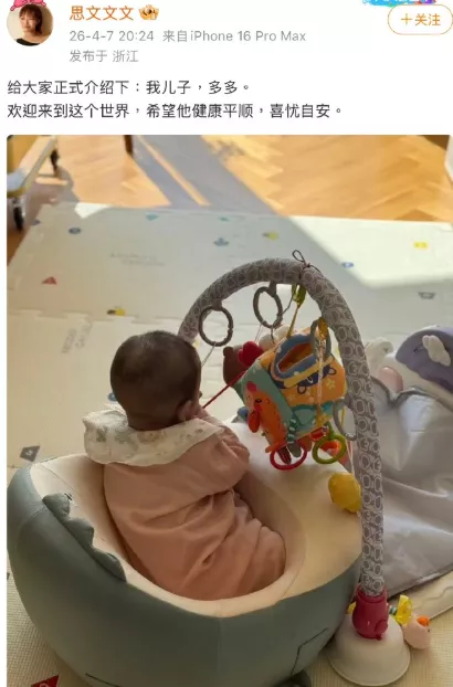 脱口秀艺人思文于2026年4月7日在个人微博晒出儿子“多多”的背影照,配文“欢迎来到这个世界,希望他健康平顺,喜忧自安”。