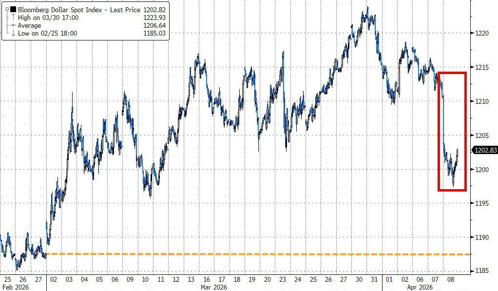 最新动态显示,美伊停火两周消息公布后,避险情绪消退导致美元指数同样承压,ICE美元指数一度重挫1.2%、回吐年内全部涨幅,彭博美元现货指数则下跌0.8%、创今年1月以来最差单日表现。