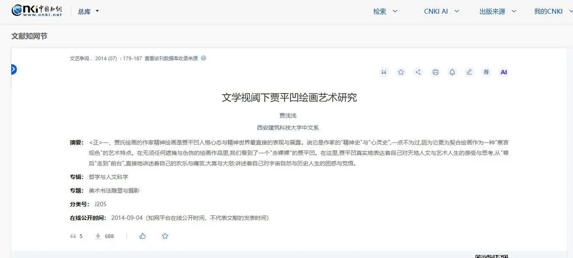 9日上午,极目新闻通过知网等渠道查询获悉,《文学视阈下贾平凹绘画艺术研究》一文,系贾浅浅2014年任西安建筑科技大学教师时所发表,目前可正常下载。