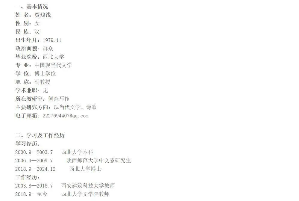 据了解,贾浅浅还曾因修改简历事件,引发舆论关注。据媒体报道,在西北大学文学院的官方网站上,贾浅浅在西北大学学习经历由“1998年9月至2003年7月中文系汉语言文学专业本科”修改为“2000年9月至2003年7月西北大学本科”。