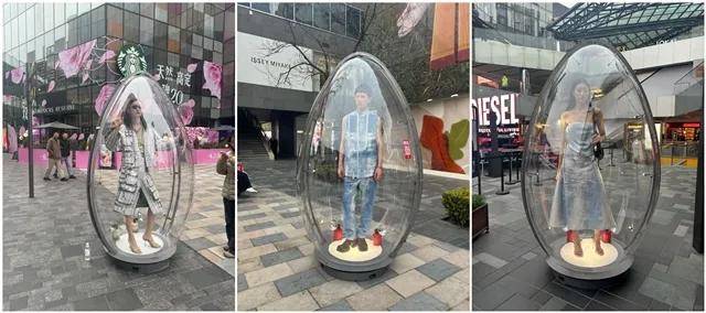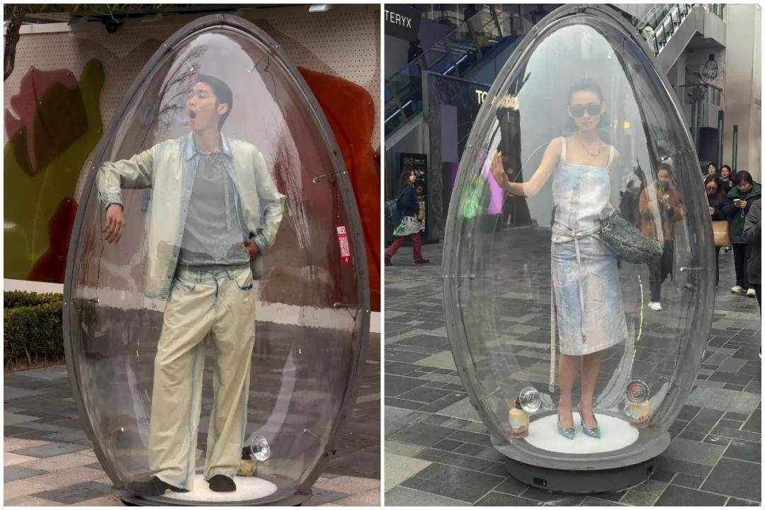 这些玻璃舱线条流畅,还带反光,一开始不少路人都以为里面是假模特,走近了才发现,居然是活生生的人,还会和路人互动。