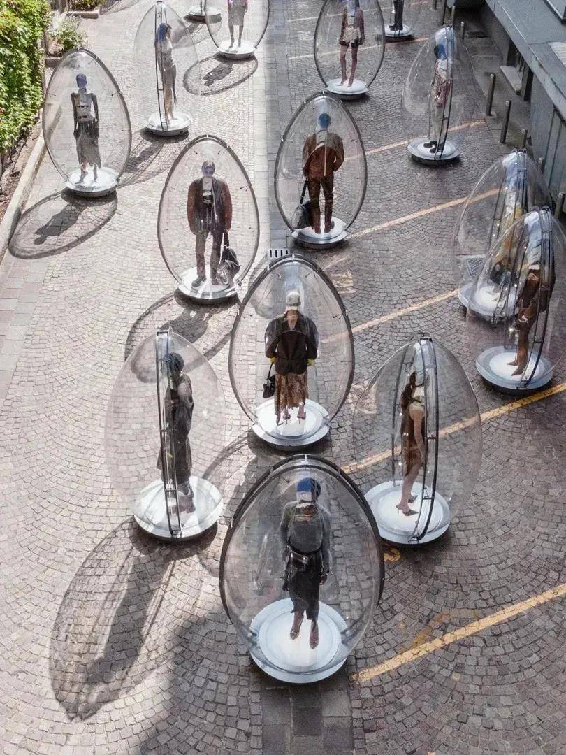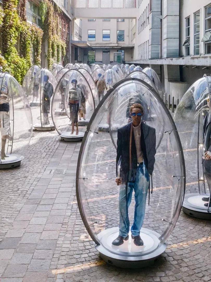 不同于传统的T台秀,Diesel此次没有搭建专属秀场,而是在三里屯街头放置了多个巨大的透明蛋形玻璃舱,试图将这片街头打造成一座“城市秀场”,让时尚离普通人更近一些。