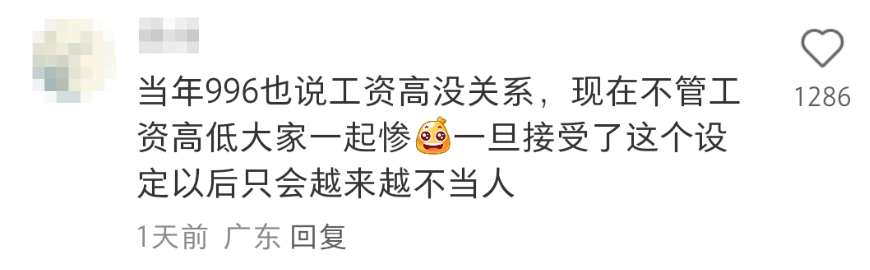 同时,有网友联想到过往的争议,感慨道:“有人说当年996也说工资高没关系,现在不管工资高低大学一起惨,一旦接受了这个设定,以后只能越来越惨了。’