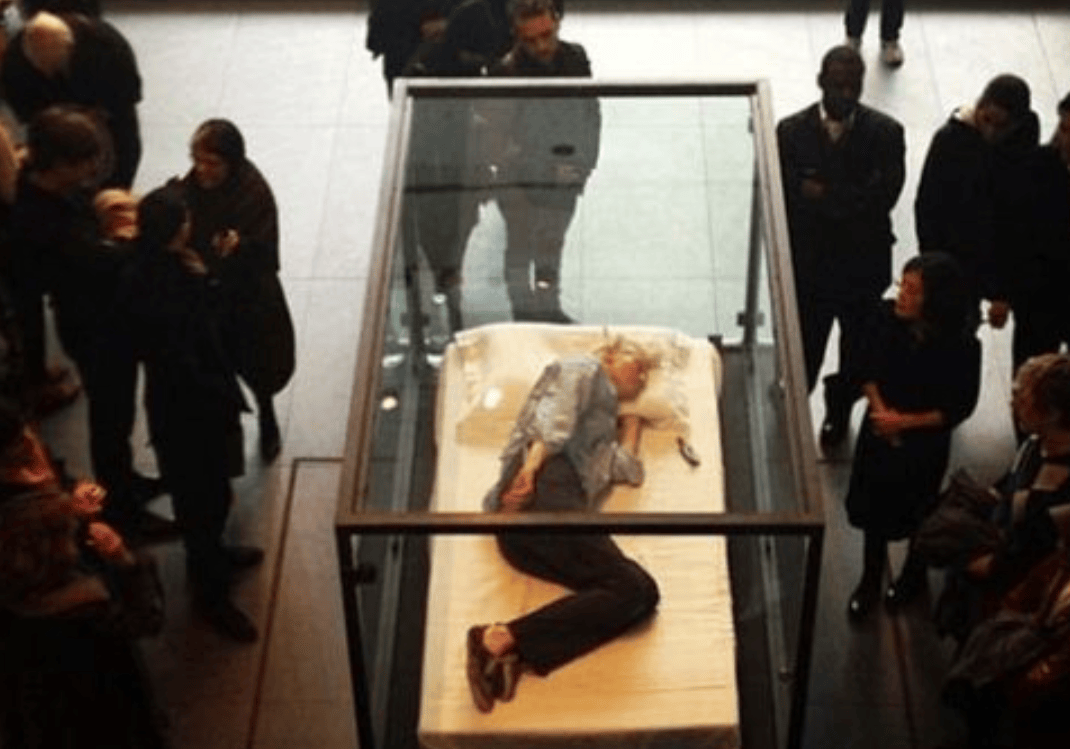 1995年,英国前卫女演员蒂尔达 斯文顿在纽约现代艺术博物馆上演行为艺术。在名叫“也许(Maybe)”的作品中,她在一樽透明玻璃柜中睡觉,供人参观。