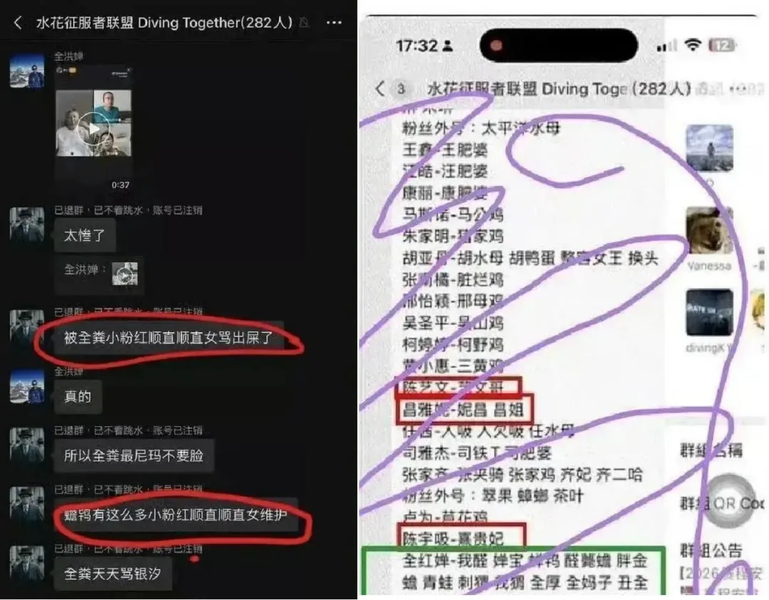 有一个名为“水花征服者联盟”的282人群组,竟将“禁止攻击其他运动员(全红婵除外)”列为群规,群内长期存在针对全红婵的侮辱性外号与人身攻击言论,不乏公然造谣、恶意P图、恶搞视频,包括将恶意伸向其家人隐私、肆意调侃,明目张胆攻击全红婵。