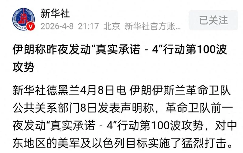 伊朗当地时间4月8日早些时候,伊朗伊斯兰革命卫队正式宣布:已完成“真实承诺-4”行动第100波攻势,对美以在中东的25个战略目标实施了精准、猛烈的打击。消息来自新华社及伊朗官方声明,时间点恰在美伊达成两周停火协议、即将启动外交谈判前后,成为停火生效前夕最重磅的军事行动。