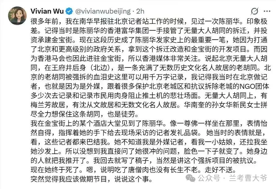 陈丽华的一生,是时代风口上投机者的缩影。她抓住制度空白,收割公共利益,踩着胡同废墟建起商业帝国,再用人设与文化包装自己。但历史不会被轻易蒙蔽,消失的胡同不会说话,老北京人心里却有一杆秤。