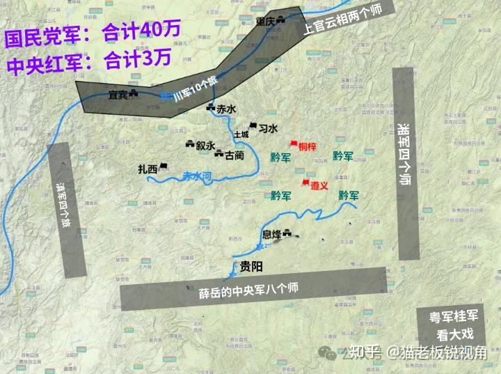 北面是长江天堑,川军准备了重兵把守;东面和南面是乌江水系,驻扎的是湘军四个师和薛岳的中央军八个师;西面是金沙江,滇军在严防死守,遵义周边则是王家烈的黔军把中央红军团团围住。
