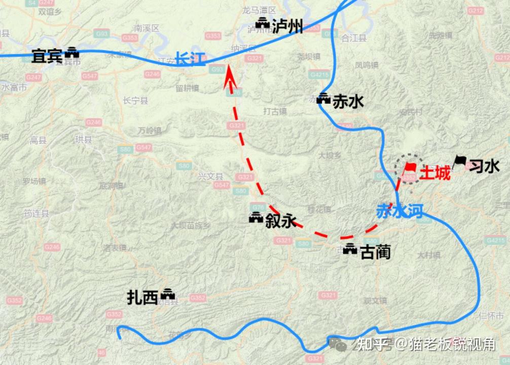 如下图所示,过长江的路线也很明确,先打下土城和赤水县城,顺着赤水县城一路往北,从泸州到宜宾一线的渡口渡过长江。
