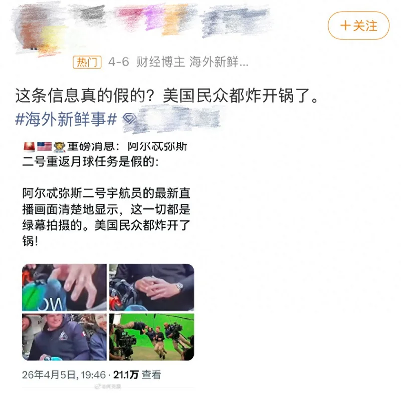 从现有公开证据看,网传“阿耳忒弥斯二号绿幕穿帮、任务摆拍”的说法没有事实依据。这是一则将转播技术故障误包装为“造假证据”的误导性信息。