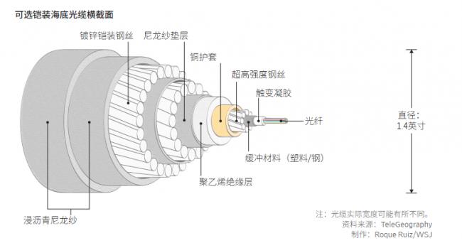 注:光缆实际宽度可能有所不同。资料来源:TeleGeography 制作:Roque Ruiz/WSJ