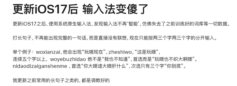 iOS 26 升级完后,很多用户就反馈中文拼音输入大幅降级,联想功能大退步,以前能完整联想出一句话,现在只能两三个字两三个字地分开输入。