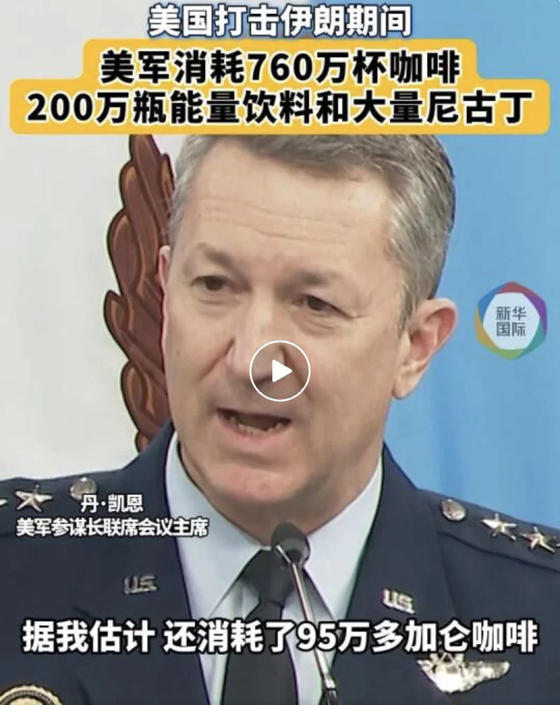 据报道,美军参谋长联席会议主席丹·凯恩8日说,在伊朗战事中,美军消耗了超过95万加仑的咖啡、200万瓶能量饮料和“大量”尼古丁。