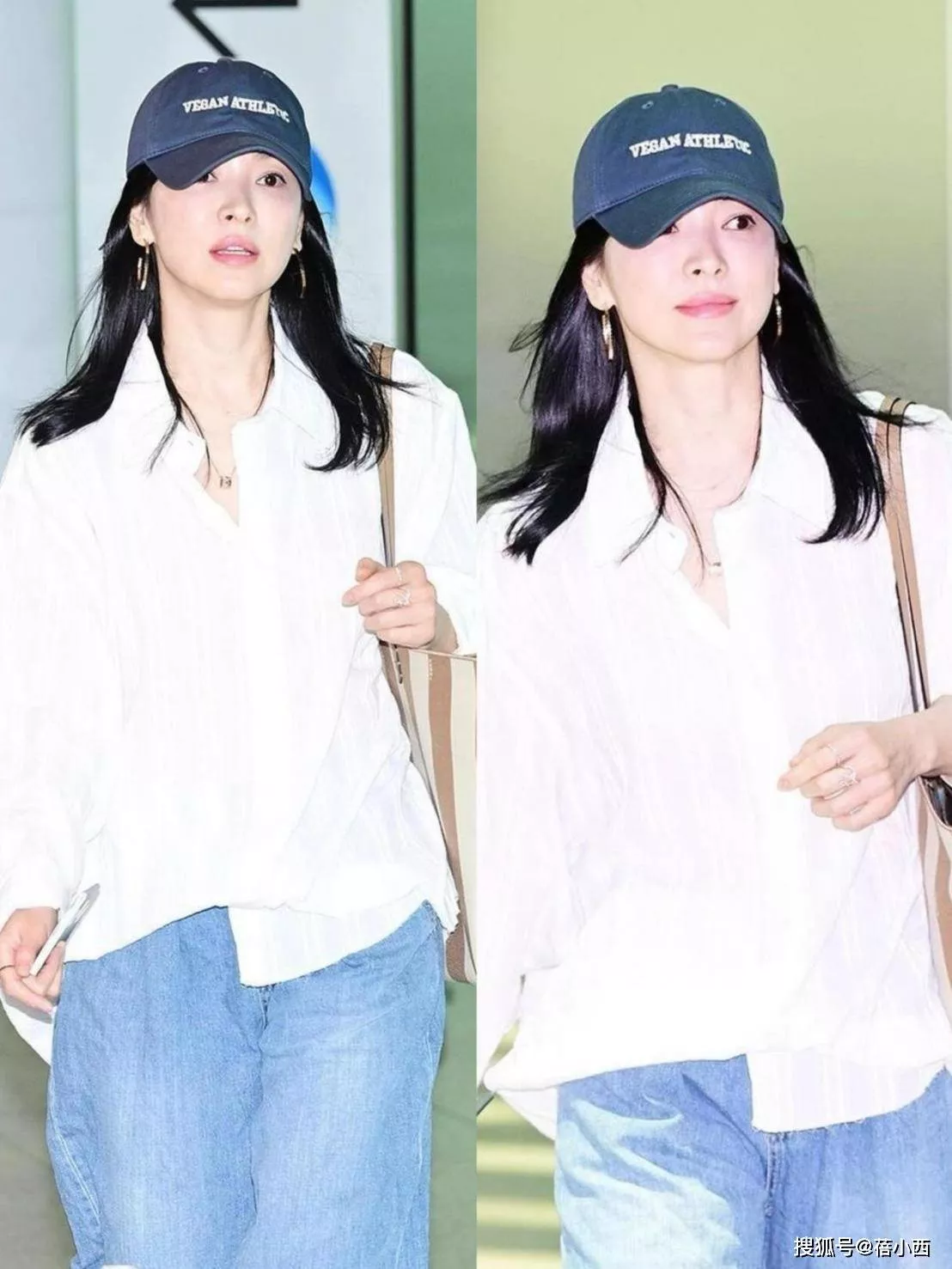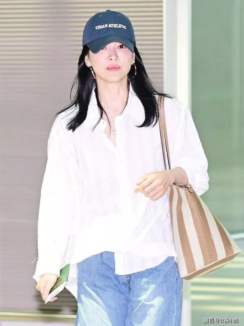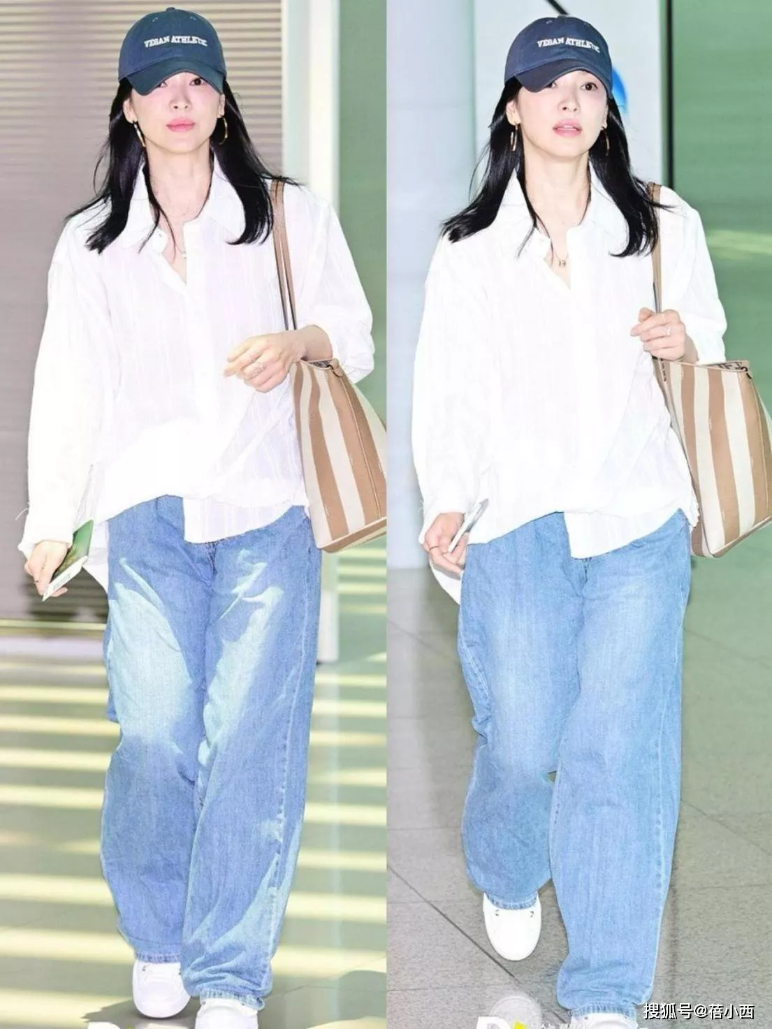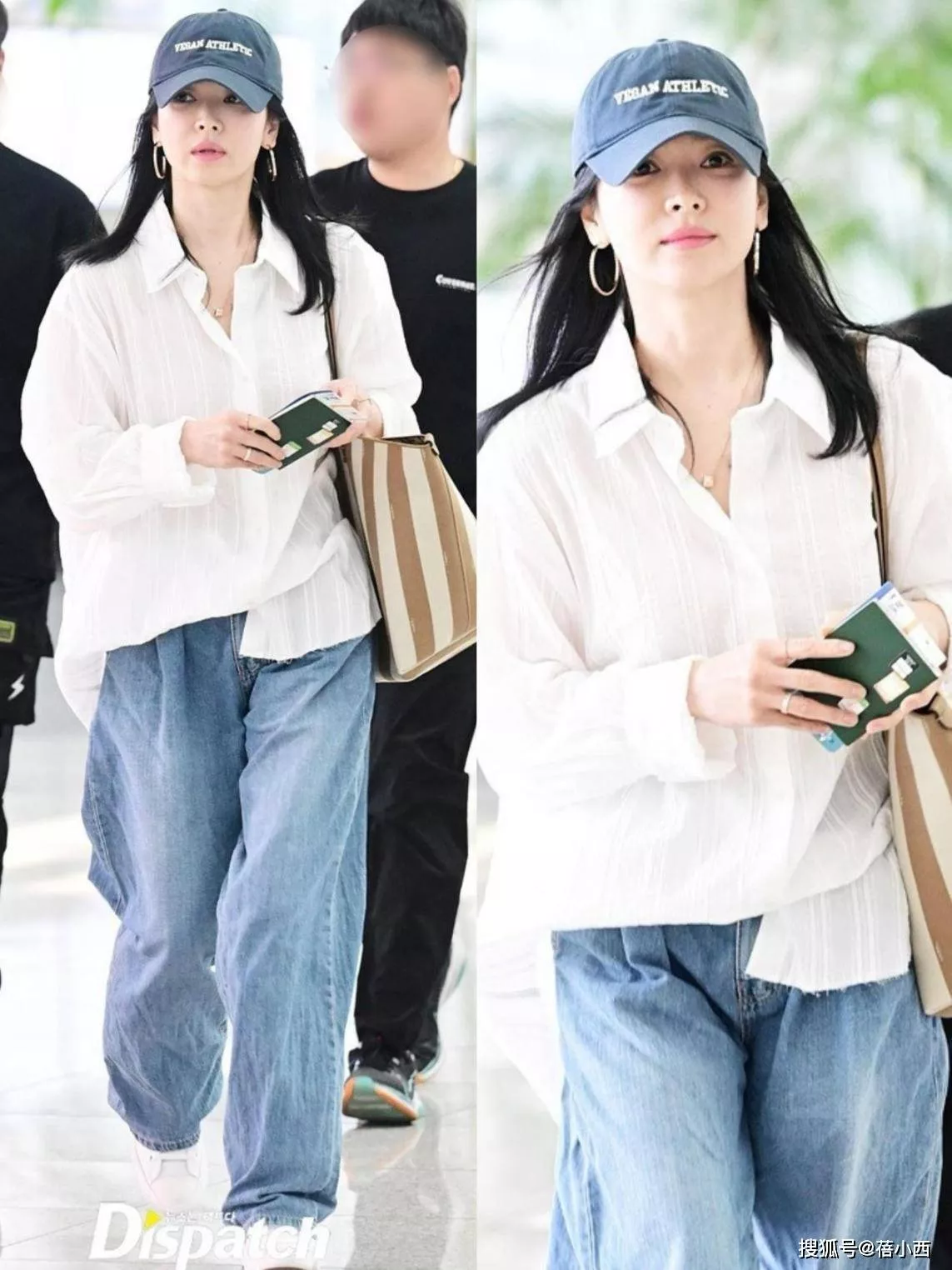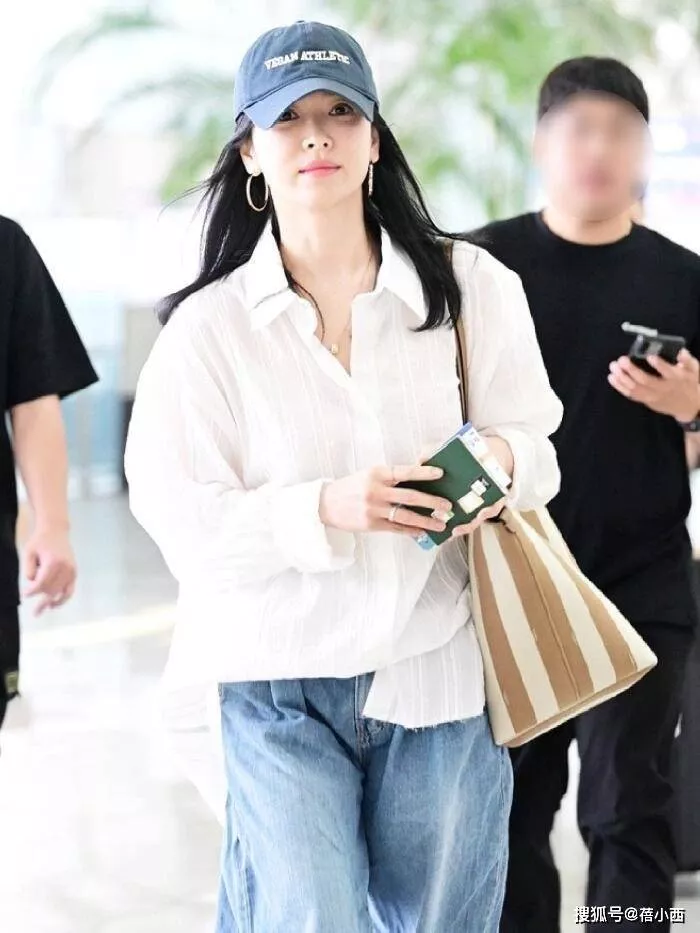 很多小个子姐妹一听到肥大的牛仔裤。第一反应就是“压个子、显邋遢、像偷穿大人衣服”,但宋慧乔用实力打破了这个刻板印象。她的这套机场造型,完全是教科书级别的,一件宽松的白色条纹衬衫,搭配一条垂坠感拉满的阔腿牛仔裤,再配上一顶棒球帽和简约配饰,没有复杂设计,却把松弛、高级、随性的氛围拉满,完全看不出只有161cm的身高。