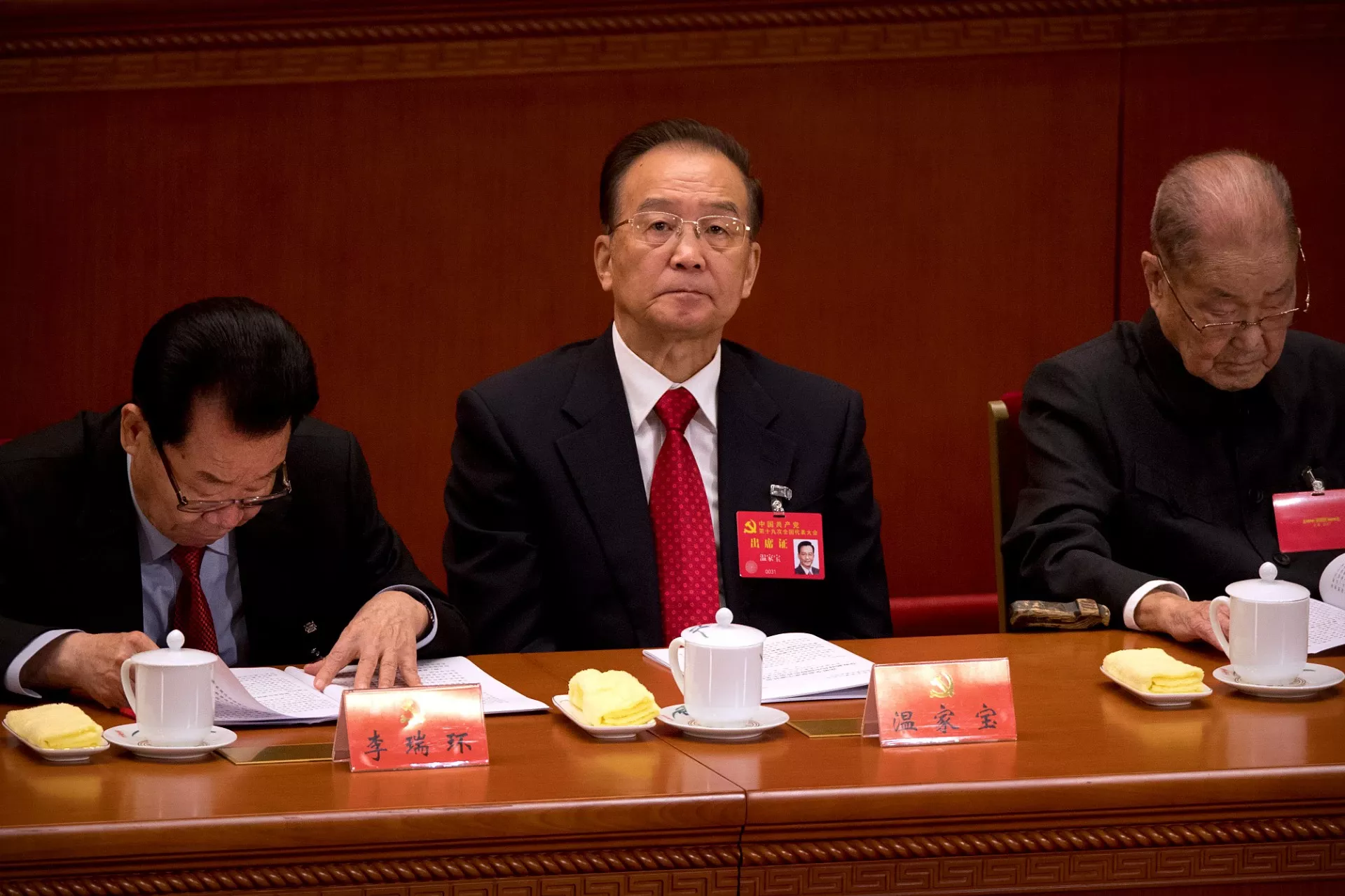 温家宝3月在北京公开现身,引起各方诸多揣测,图为其在2017年出席中共第19届全国代表大会的画面。(资料照片/美联社)