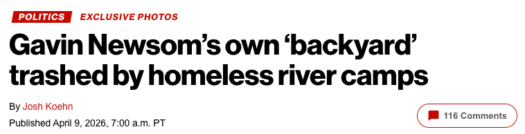 加州州长纽森(Gavin Newsom)表示,他在解决无家可归问题上“从未松懈”,但批评者指出,他连自己家门口的沙加缅度河(Sacramento river)都没管好,该流域堆满了令人震惊的垃圾。