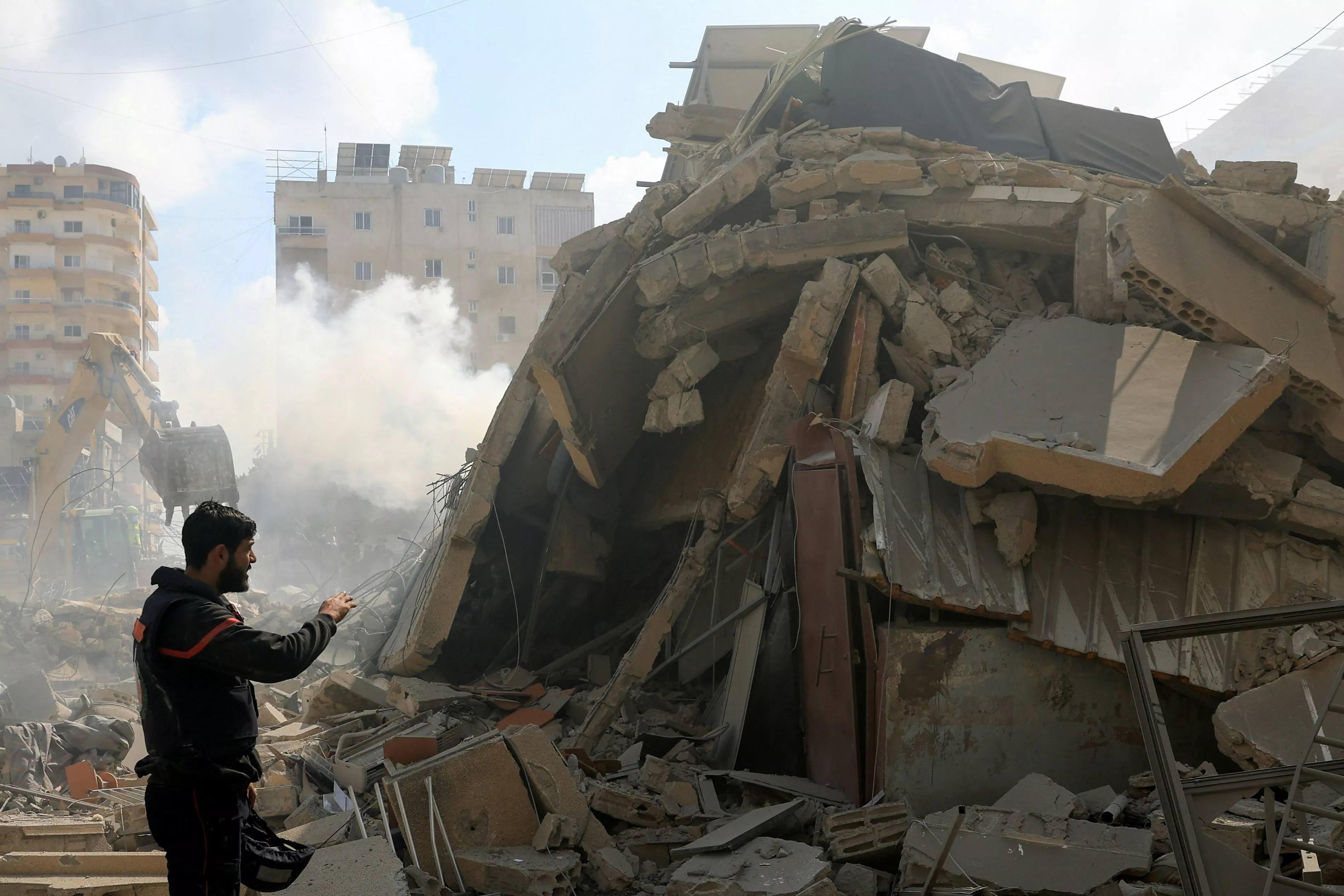 图为2026年4月8日,黎巴嫩南部城市提尔(Tyre)遭以色列大规模空袭,多处建筑物沦为废墟,救援人员到场展开搜救。(Reuters)