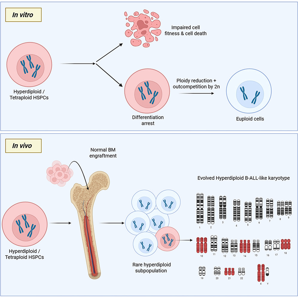 随后,研究团队通过体外细胞培养、免疫缺陷小鼠骨髓移植等实验,长期追踪超二倍体细胞的存活、分化、增殖能力,以及是否会直接引发白血病。