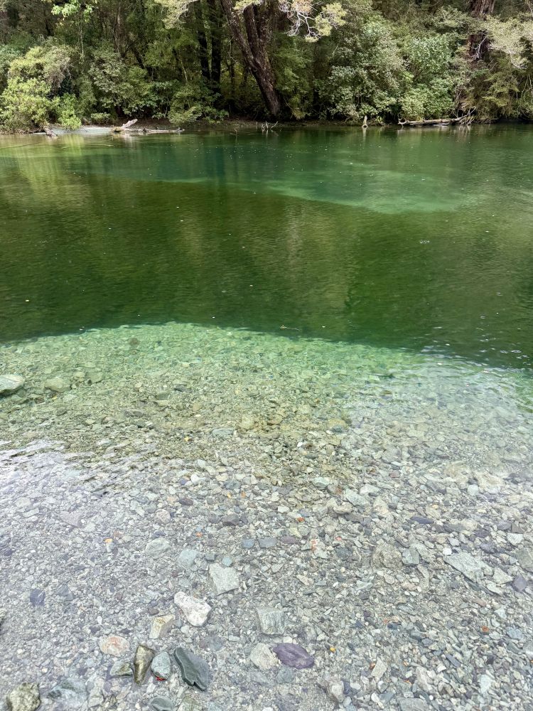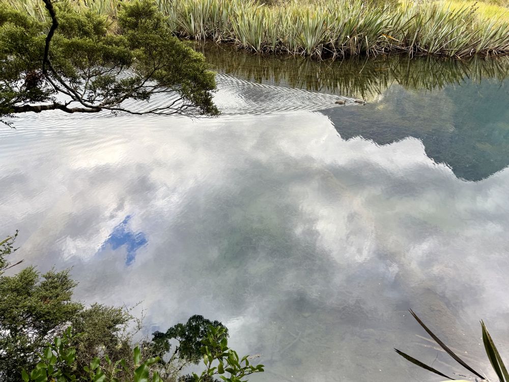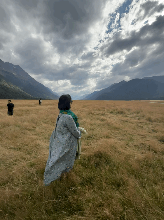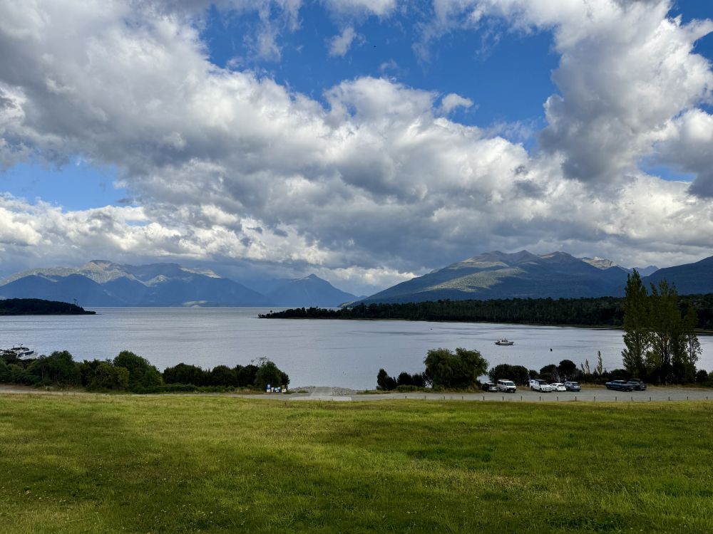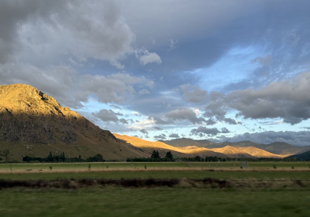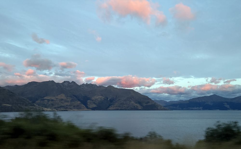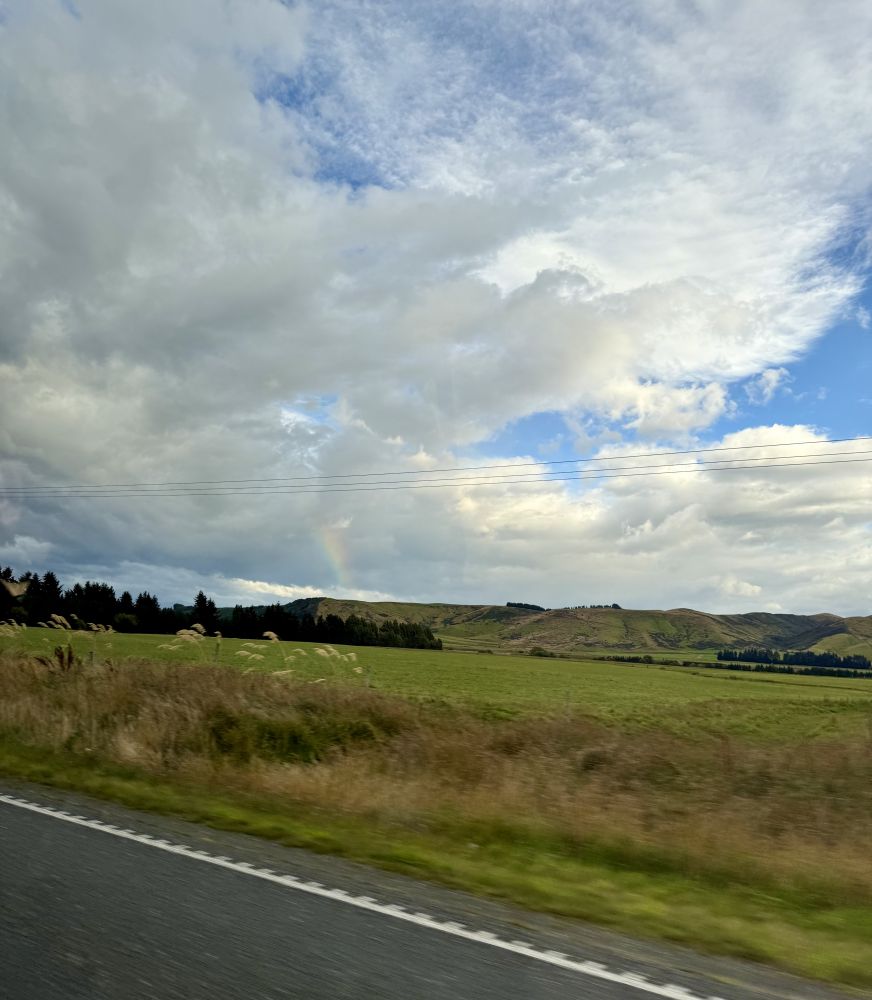 一路上,他带我们看被霞光染红的云彩,看披着金光的山岭。 被群山环抱的湖泊 (Te Anau)透着一种与世无争的淡泊;白云之间忽然露出一角彩虹,仿佛只是路过,向人轻轻打声招呼。
