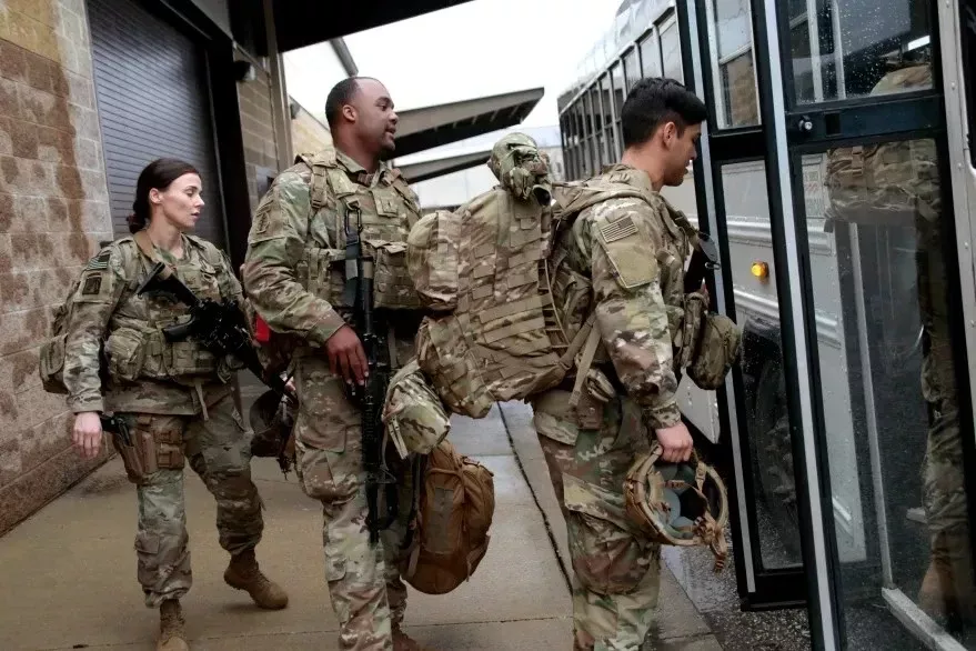 在北卡罗来纳州布拉格堡,美国陆军士兵2020年1月携带装备搭乘巴士。(美联社)