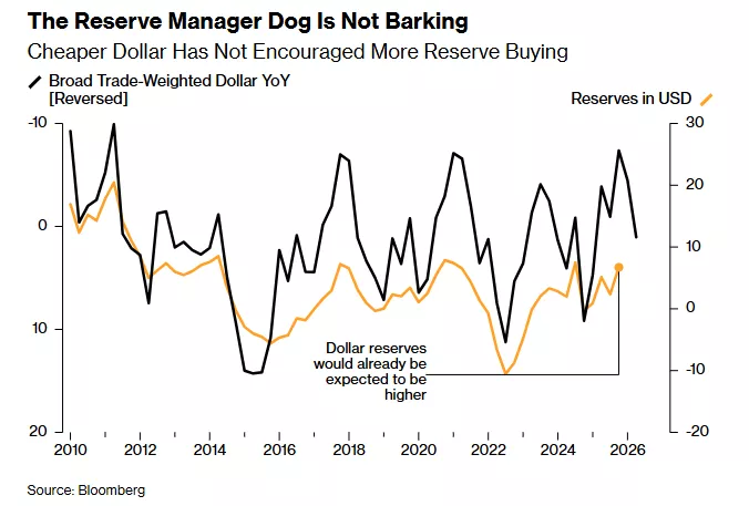 同样的论点也可以用于黄金 。 各国央行的持有量,可能只是被动受益于近年来金价上涨 。 但如果将调整后的美元储备视为这种货币的 “ 实际权重 ”,那么自 2014 年前后官方持有美元达到峰值以来,这一权重已下降 15%。