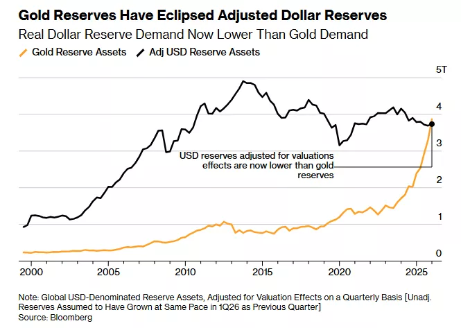 美国与伊朗的战争对全球贸易体系造成了可能不可逆的压力 。 经估值调整后,数十年来,黄金储备首次超过了各国央行持有的美元资产规模 。