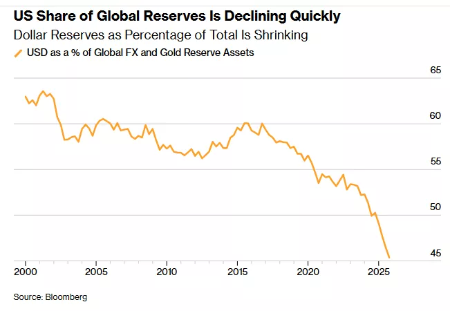 过去几年,全球以美元计价的贸易占比已降至约 40%,而欧元和人民币占比上升;以美元计价的国际贷款占全球总量的比例降至 60%;各国央行持有的美国国债已少于持有的黄金;美元在全球外汇与黄金储备中的占比也在迅速下降 。