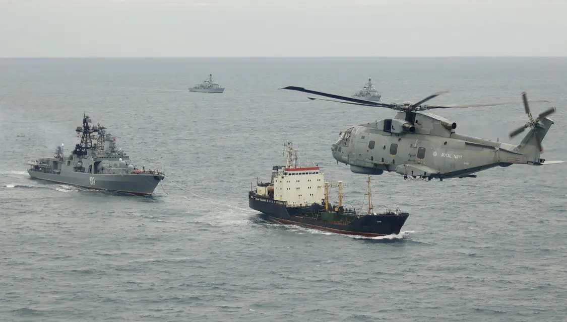 英国皇家海军出动了23型护卫舰“圣奥尔本斯”号、潮汐级补给舰“泰德斯普林”号以及梅林直升机对三艘俄罗斯潜艇进行跟踪。