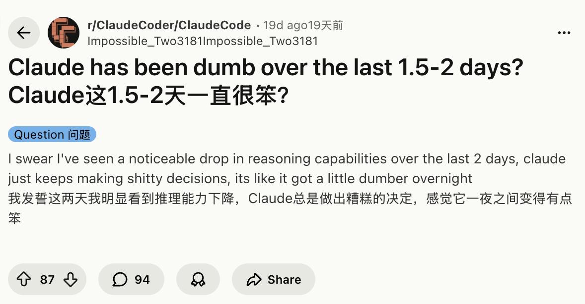 大概从今年 2 月开始,Claude 和 Claude Code 就迎来了「史诗级性能削弱」。Reddit 的 r/ClaudeCode 和 r/ClaudeAI 里,相关帖子刷屏,有人直接发帖《4.6 Regression is real!》,有人吐槽「Claude Code has been dumb over the last 1.5-2 days」。