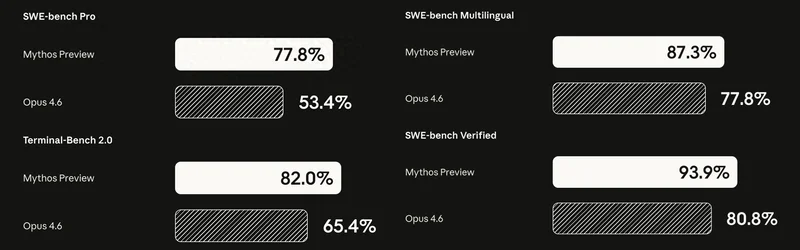 昨天夜里,Anthropic 最新发布的 Claude Mythos(神话)预览版,又让整个 AI 圈炸锅了。Claude Mythos 预览版,官方自称「迄今为止最强大的 AI 模型」,一个全新能力层级,甚至大幅甩开了之前自家最强的 Claude Opus 4.6。至少从目前展现出的数据和结果来看,这不是营销话术,是真正质的飞跃。首先在几乎所有公开基准测试上,Claude Mythos 预览版都是第一,更为惊艳的是它的进步幅度: