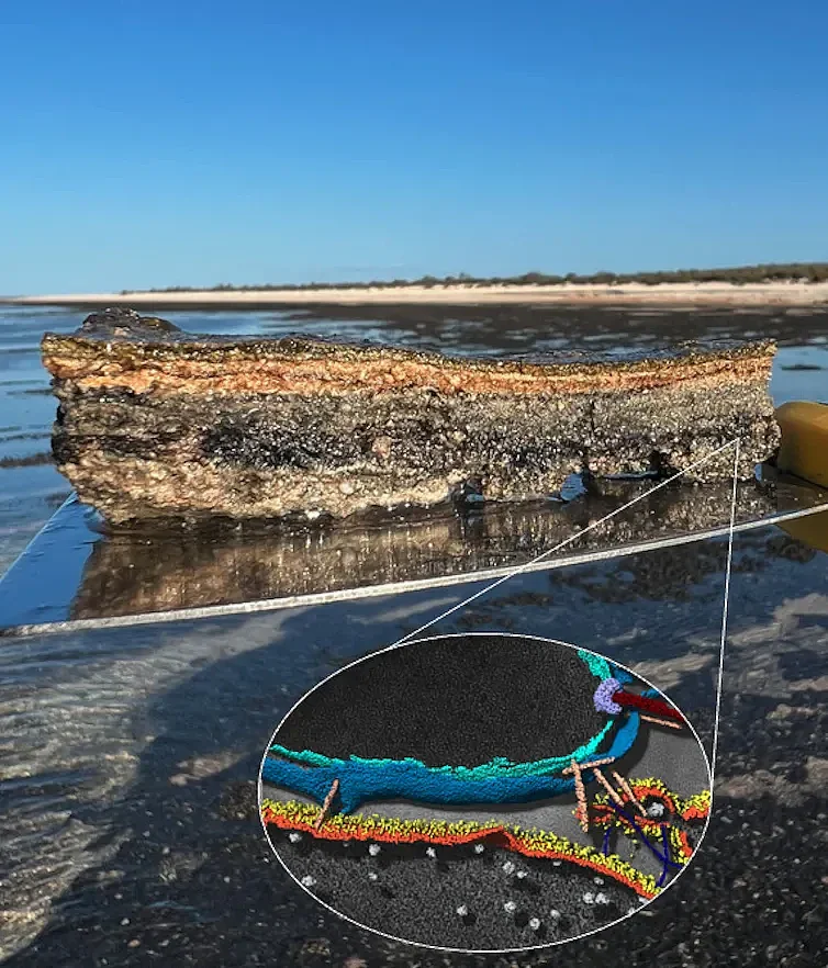 来自 Gathaagudu(澳洲 Shark Bay)的微生物席。插图:显微图像显示,源自这些微生物席的阿斯加德古菌和细菌正在互动,作为复杂细胞进化的模型。Iain Duggin/Bindusmita Paul/Debnath Ghosal/Matthew Johnson/Brendan Burns.
