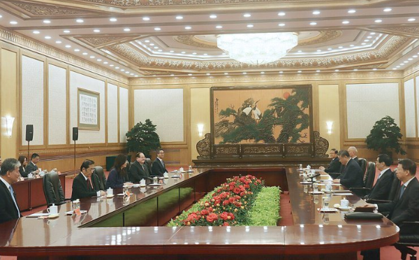 郑习会上午在北京人民大会堂东大厅举行,国民党主席郑丽文(左三)率智库副董事长李鸿源(左起)与三位副主席张荣恭、李干龙、萧旭岑与中共中央总书记习近平(右三)、台办主任宋涛(右起)、政治局常委王沪宁、蔡奇、发改委主任郑栅洁会谈。 记者廖士锋/摄影