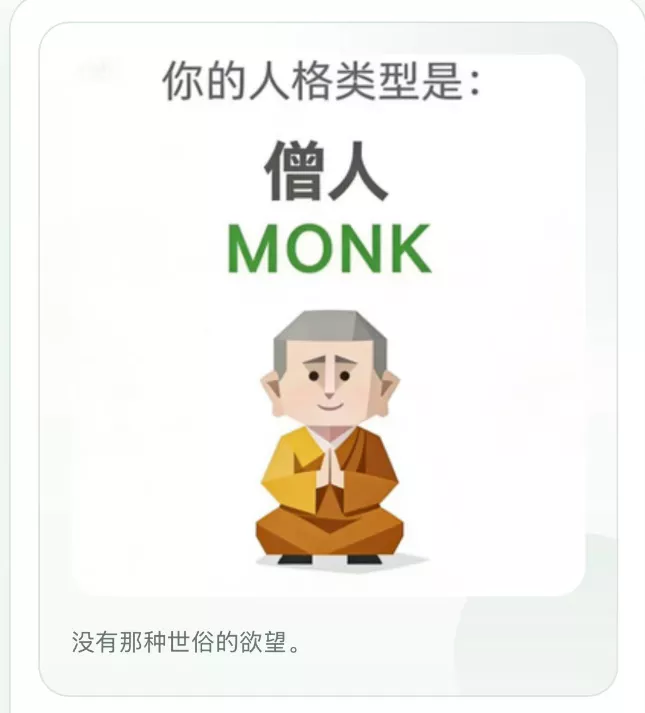 小雷测出来的人格类型是「MONK」(僧人),下面还有一句简介:没有那种世俗的欲望。