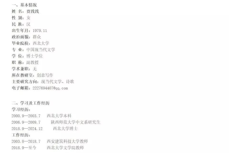 据了解,贾浅浅还曾因修改简历事件,引发舆论关注。据媒体报道,在西北大学文学院的官方网站上,贾浅浅在西北大学学习经历由“1998年9月至2003年7月中文系汉语言文学专业本科”修改为“2000年9月至2003年7月西北大学本科”。
